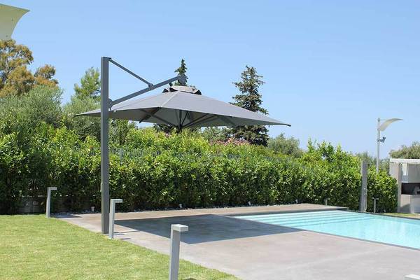 Η κρεμαστή ομπρέλα σε αντίθεση με αυτήν που είναι κλασικού τύπου, χαρακτηρίζεται από την ευελιξία και τη λειτουργικότητάς της, καθώς η στήριξή της γίνεται σε πλαϊνή δοκό, και επιπλέον όταν κλείνει δεν πιάνει χώρο. Η λειτουργία της γίνεται με μανιβέλα. Αποτελείται απο σκελετό ειδικού κράμματος αλουμινίου, πλαστικούς συνδέσμους με πυράκια και inox εξαρτήματα. Το ύφασμα που χρησιμοποιείται είναι υψηλής αντοχής αδιάβροχο τεντόπανο δική σας χρωματικής επιλογής με δυνατότυτα εκτύπωσης λογότυπων.